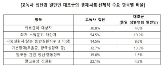 아울러 조현병·우울증 등 정신 질환과 알코올 사용 관련 정신질환 및 알코올성 간질환 등 알코올 연관 질환도 고독사 집단에서 월등히 높은 수준으로 관찰됐다.
