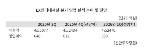 한편, 신한투자증권은 LX인터내셔널이 올해 1·4분기 매출액 4조2276억원, 영업이익 942억원을 기록하며 전년 동기 대비 각각 7.2%, 5.6% 증가할 것으로 내다봤다.