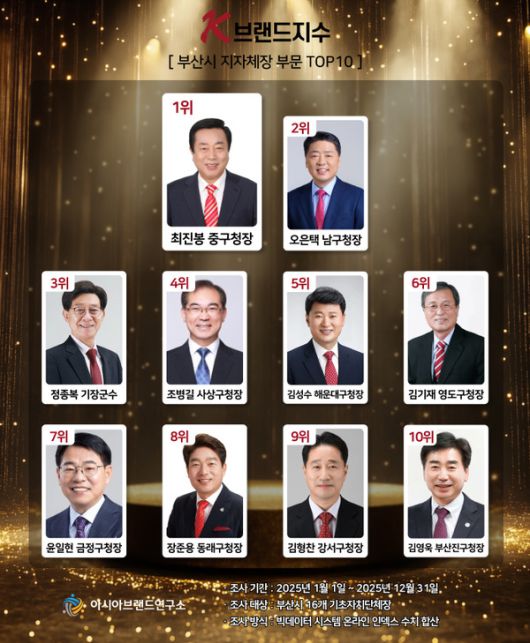 한정근 아시아브랜드연구소 대표는 "2025년 연간 집계로 산출된 이번 K-브랜드지수 부산시 지자체장 부문은 '행정 성과의 크기'보다 '구민 소통의 능력'이 주요 키워드로 부상한 결과로 보인다. 최진봉 중구청장의 1위 등극은 도시 규모나 예산과 무관하게, 실질적인 정책 추진과 생활환경 개선 효과가 반영된 사례"라고 설명했다.