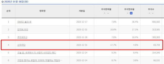 6일 영화관입장권 통합전산망에 따르면 '신의악단'은 '아바타: 불과 재', '주토피아 2' 등 초대형 블록버스터와 '만약에 우리' 등 동시기 경쟁작들 사이에서 압도적인 수치로 좌석판매율 1위(17.1%, 1월5일 기준)를 차지하며 알짜배기 흥행을 이어가고 있다.