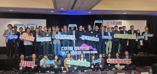 6일 오후 5시(현지시간) 미국 라스베이거스 소재 플라밍고 호텔에서 열린 ‘디지털 청년인재 토크콘서트@CES 2026’ 참석자들이 기념촬영을 하고 있다. [사진=아주미디어그룹 CES 특별취재단] |