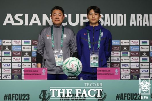 한국 U23 대표팀의 이민성 감독(왼쪽)과 김동진이 7일 이란과 2026 AFC U-23 아시안컵 C조 1차전을 앞두고 가진 기자회견에서 선전을 다짐하고 있다./리야드=KFA |