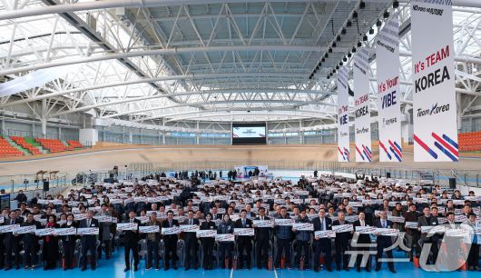 (진천=뉴스1) 김성진 기자 = 최휘영 문화체육관광부 장관, 유승민 대한체육회장, 쇼트트랙 최민정을 비롯한 선수단이 7일 충북 진천선수촌 벨로드롬에서 열린 2026 국가대표 훈련개시식에서 기념촬영을 하고 있다. 2026.1.7/뉴스1