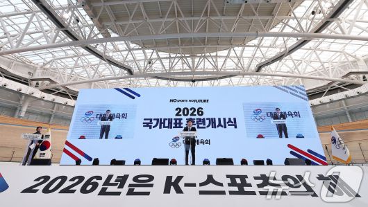 (진천=뉴스1) 김성진 기자 = 유승민 대한체육회장이 7일 충북 진천선수촌 벨로드롬에서 열린 2026 국가대표 훈련개시식에서 개식사를 하고 있다. 2026.1.7/뉴스1ssaji@news1.krCopyright ⓒ 뉴스1. All rights reserved. 무단 전재 및 재배포, AI학습 이용 금지.