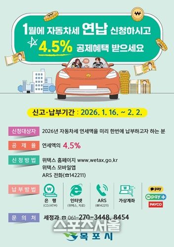 [스포츠서울┃조광태 기자] 전남 목포시는 2026년도 자동차세 연납 신청을 1월 한 달간 접수 한다.