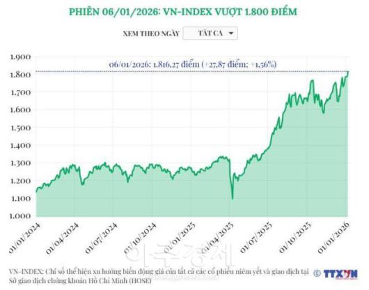 6일(현지 시각) VnExpress 등 현지 매체에 따르면, 베트남 증시는 새해 개장 단 이틀 만에 사상 최고치를 갈아치웠다. 이날 마감 기준, 호찌민증권거래소(HoSE)의 VN지수는 전일 대비 27.87포인트 상승한 1816.27포인트를 기록했다. 베트남 증시 역사상 지수가 1800선을 돌파한 것은 이번이 처음이다.