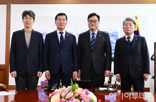 아시아투데이 이병화 기자 = 우원식 국회의장과 신정훈 국회 행정안전위원장을 비롯한 참석자들이 7일 국회에서 열린 국민투표법 개정 간담회에 앞서 기념촬영을 하고 있다. 왼쪽부터 국회 행정안전위원회 윤건영 더불어민주당 간사, 신 위원장, 우 의장, 정재황 국회 국민 미래 개헌자문위원장. ⓒ "젊은 파워, 모바일 넘버원 아시아투데이"