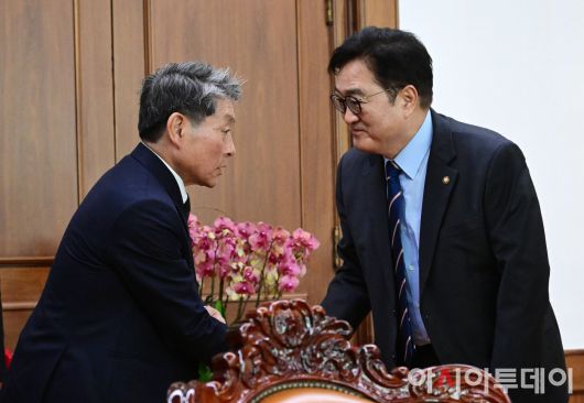 아시아투데이 이병화 기자 = 우원식 국회의장이 7일 국회에서 열린 국민투표법 개정 간담회에서 정재황 국회 국민 미래 개헌자문위원장과 인사를 나누고 있다. ⓒ "젊은 파워, 모바일 넘버원 아시아투데이"