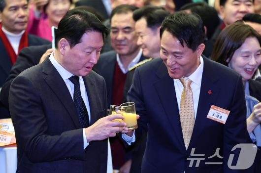 (서울=뉴스1) 김도우 기자 = 오세훈 서울시장과 최태원 대한상공회의소 회장이 7일 서울 중구 대한상공회의소에서 열린 2026 서울시 신년인사회에서 건배를 하고 있다. 2026.1.7/뉴스1pizza@news1.krCopyright ⓒ 뉴스1. All rights reserved. 무단 전재 및 재배포, AI학습 이용 금지.