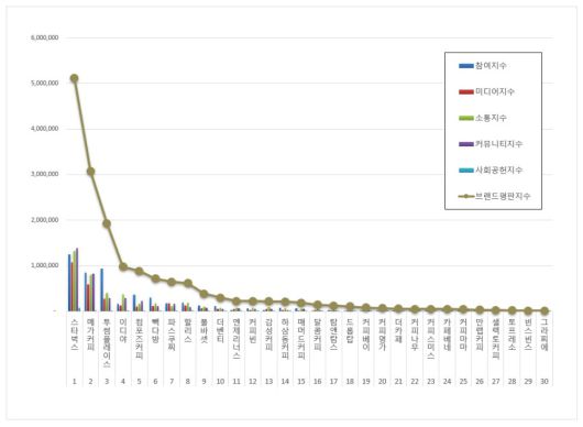 커피전문점 브랜드평판 1위를 기록한 스타벅스 브랜드는 참여지수 1,252,878, 미디어지수 1,076,352, 소통지수 1,322,701, 커뮤니티지수 1,381,597, 사회공헌지수 78,308로 집계되며 브랜드평판지수 5,111,835를 기록했다. 이는 지난 12월 브랜드평판지수 4,627,641과 비교해 10.46% 상승한 수치다.