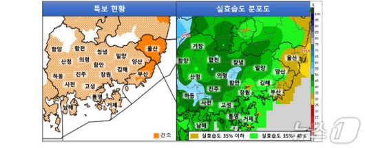 이날 오전 10시 경남도내 주요 지점 실효습도는 김해 34%, 거제 34%, 창원 35%, 함양 39%, 산청 40%, 합천 40% 등이다.