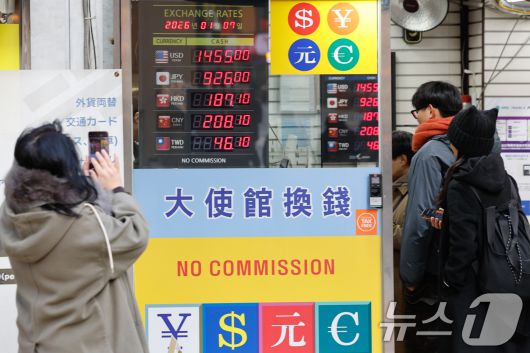 (서울=뉴스1) 안은나 기자 = 7일 서울 중구 명동의 환전소에서 관광객들이 환전을 하고 있다. 한국은행 경제통계시스템(ECOS)에 따르면 지난해 12월 뉴스심리지수는 평균 113.07을 기록했다. 고환율과 물가 부담이 동시에 덮치면서 상승세를 타던 경제 심리가 4개월 만에 꺾인 것으로 보인다. 2026.1.7/뉴스1