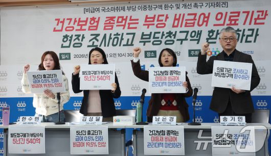 (서울=뉴스1) 김명섭 기자 = 7일 서울 종로구 경제정의실천시민연합(경실련)에서 경실련 활동가들이 비급여 국소마취제 부당 이중청구액 환수 및 개선 촉구 기자회견을 하고 있다. 경실련에 따르면 국소마취제는 의료행위 수가에 재료비로 이미 포함되어 환자에게 비급여 비용을 청구할 수 없으나 의약품 제조사(유통사)는 급여와 동일한 성분·효능의 의약품을 등재하진 않고 의료기관은 수십배 비싼 비급여 제품을 사용하고 비용을 환자에게 이중 청구한 것으로 내다보고 있다. 2026.1.7/뉴스1