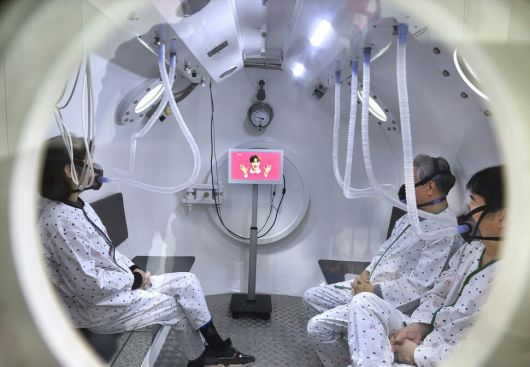 방사선치료 후 부작용을 겪는 환자들이 지난 22일 고압산소치료를 받고 있다. |