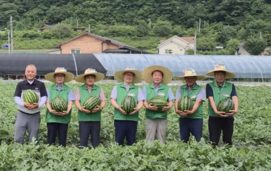 봉화 재산지구 수박 시설재배 현장에서 지난해 7월 경북도 관계자와 농민들이 특화형 공동영농 도입을 기념하며 수박을 들어 보이고 있다. 경북도 제공 |