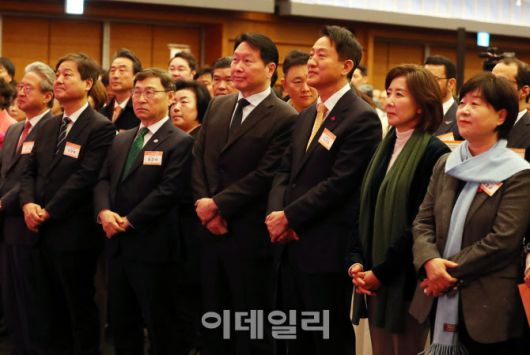 [이데일리 김태형 기자] 오세훈(앞줄 오른쪽 세번째부터) 서울시장과 최태원 서울상공회의소 회장, 정근식 서울시교육감 등이 7일 서울 중구 대한상의에서 열린 2026년 신년인사회에 참석하고 있다. 이날 신년인사회에는 서울시의회 의장, 서울시교육감, 국회의원, 시의원, 주한외교사절 등 각계인사 약 900여 명이 참석했다.