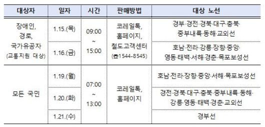 19일부터 21일까지 오전 7시부터 오후 1시까지는 경로·장애인·국가유공자(교통지원 대상)를 포함한 모든 국민을 대상으로 예매가 진행된다.
