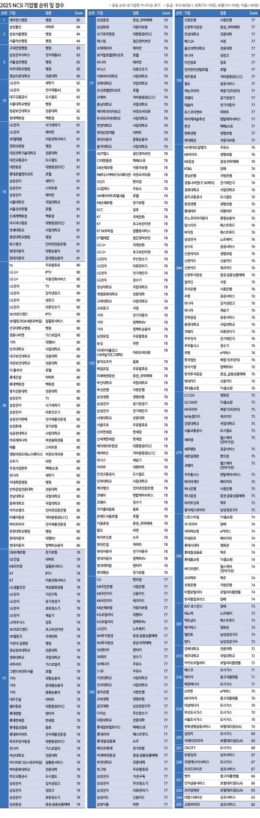 전체 조사 대상 가운데 가장 높은 평가를 받은 곳은 병원 업종의 세브란스병원으로, 85점을 기록하며 전체 1위에 올랐다. 고객만족도 82점 이상을 기록한 상위 TOP15에는 세브란스병원을 포함해 병원 7개, 아파트 부문의 삼성물산, 전자제품 AS 부문의 삼성전자서비스와 LG전자, 세탁기의 LG전자, 전문대학의 영남이공대학교와 원광보건대학교, 도시철도의 대구교통공사, 백화점의 현대백화점 등이 이름을 올렸다.