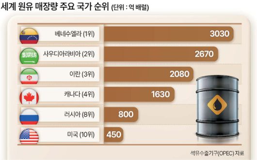 베네수엘라는 원유 매장량이 3000억 배럴이 넘는 세계 1위 원유 보유국이다. 그러나 우고 차베스 전 대통령에서 마두로 대통령으로 이어지는 좌파 정권을 거치며 석유 산업이 쇠락했다. 차베스 전 대통령은 2007년 석유 사업을 국영화했고, 엑슨모빌과 코노코필립스 등 미국 회사들이 투자한 인프라를 몰수했다. 이후 두 회사는 베네수엘라에서 철수했고, 베네수엘라는 오랫동안 미국의 제재를 받아왔다. 여기에 석유 인프라도 노후화 되면서 원유 생산량은 매장량의 10분의 1 수준으로 떨어졌다.