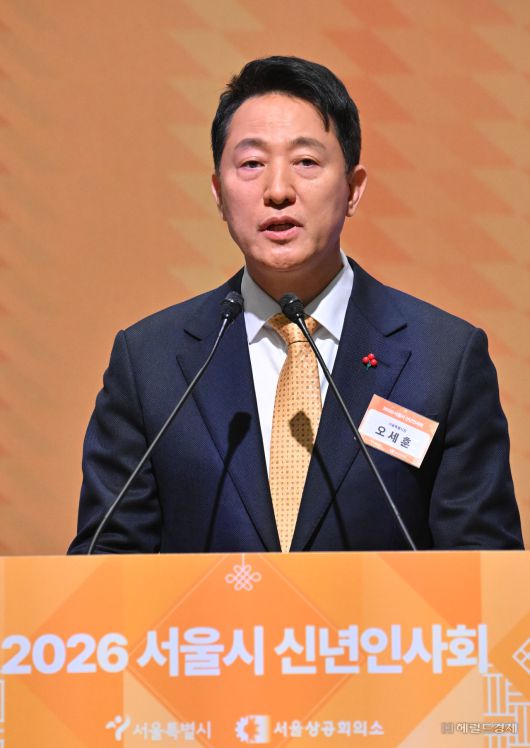 [헤럴드경제=임세준 기자] 오세훈 서울시장이 7일 오전 서울 중구 대한상공회의소 국제회의장에서 열린 2026 서울시 신년인사회에서 신년사를 하고 있다.