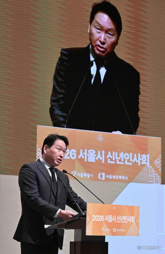 [헤럴드경제=임세준 기자] 최태원 대한상의 회장이 7일 오전 서울 중구 대한상공회의소 국제회의장에서 열린 2026 서울시 신년인사회에서 신년사를 하고 있다.
