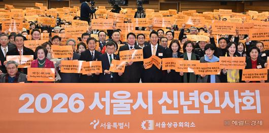 [헤럴드경제=임세준 기자] 오세훈(오른쪽 여섯 번째) 서울시장과 최태원(왼쪽 여섯 번째) 대한상의 회장을 비롯한 내빈들이 7일 오전 서울 중구 대한상공회의소 국제회의장에서 열린 2026 서울시 신년인사회에서 기념촬영을 하고 있다.