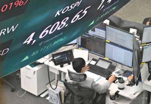 [헤럴드경제=임세준 기자] 코스피가 7일 상승 출발해 장중 사상 첫 4600선을 돌파했다. 이날 오전 서울 중구 하나은행 딜링룸 전광판에 코스피 지수가 4600선을 기록하고 있다.