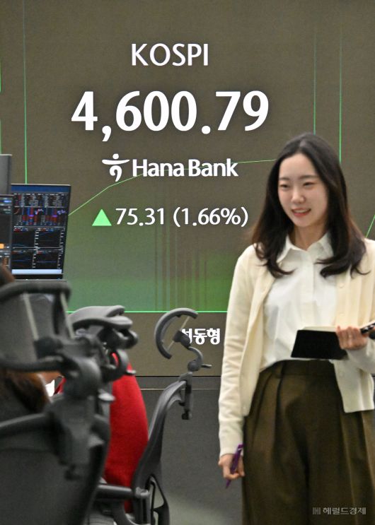 [헤럴드경제=임세준 기자] 코스피가 7일 상승 출발해 장중 사상 첫 4600선을 돌파했다. 이날 오전 서울 중구 하나은행 딜링룸 전광판에 코스피 지수가 4600선을 기록하고 있다.