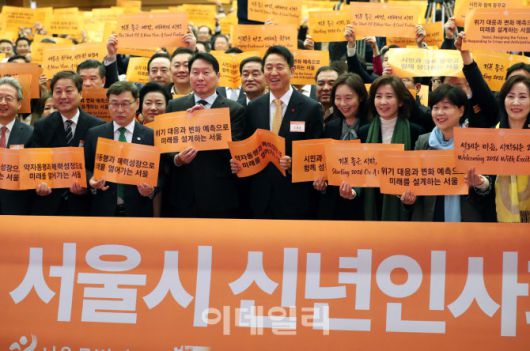 [이데일리 김태형 기자] 오세훈(앞줄 오른쪽 다섯번째부터) 서울시장과 최태원 서울상공회의소 회장, 정근식 서울시교육감 등이 7일 서울 중구 대한상의에서 열린 2026년 신년인사회에 참석해 새해희망 퍼포먼스를 하고 있다. 이날 신년인사회에는 서울시의회 의장, 서울시교육감, 국회의원, 시의원, 주한외교사절 등 각계인사 약 900여 명이 참석했다.
