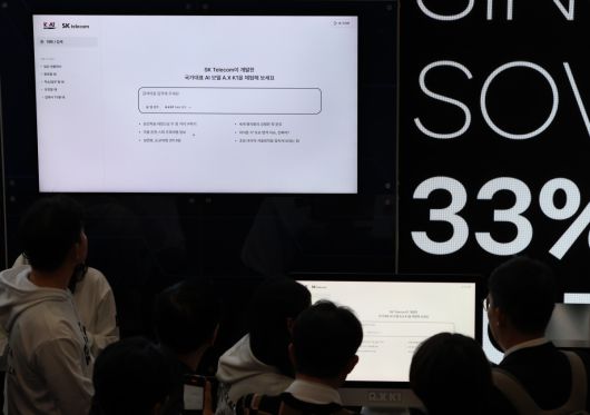지난해 12월 30일 오후 서울 강남구 코엑스에서 열린 독자 AI 파운데이션 모델 프로젝트 1차 발표회에서 SK텔레콤 부스를 찾은 시민들이 A.X AI 체험을 하고 있다. |