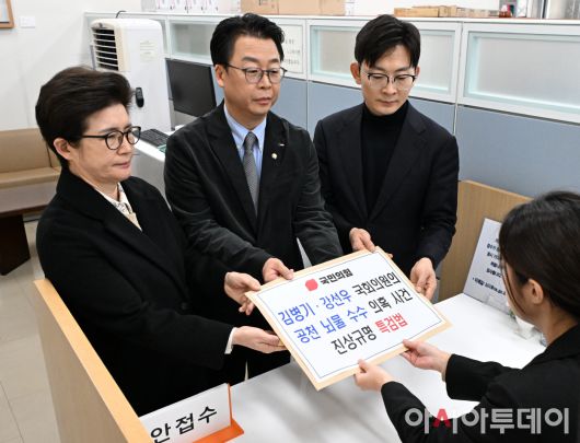 아시아투데이 송의주 기자 = 국민의힘 곽규택 원내수석대변인 등 원내부대표단이 7일 국회 의안과에서 '더불어민주당 공천뇌물 수수 의혹 사건 특검법안'을 제출하고 있다.