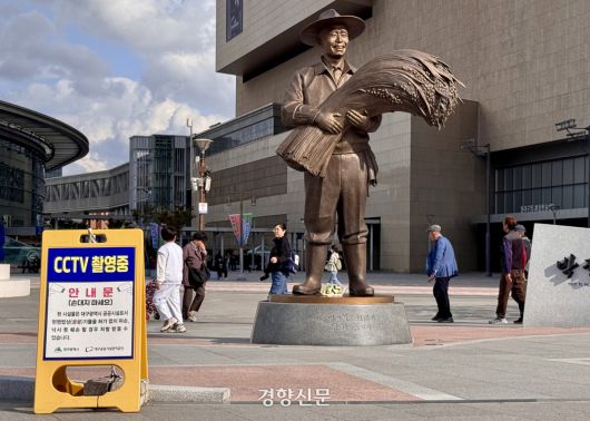 동대구역 광장 ‘박정희 동상’ 인근을 지난해 10월23일 시민들이 오가고 있다. 동상 훼손을 막기 위해 폐쇄회로(CC)TV 촬영 중이라는 안내판이 설치돼 있다. 인근에는 감시 초소도 놓여 있다. 백경열 기자 |