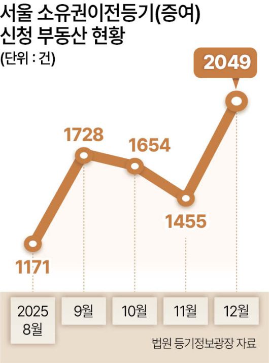 7일 법원 등기정보광장 통계(잠정치)에 따르면 지난해 12월 서울 부동산 증여 목적 소유권 이전 등기 신청은 2047건으로 집계됐다. 이는 2022년 5월 이후 최고치다. 특히 강남권과 ‘한강 벨트’ 핵심지에서 증가세가 뚜렷했다. 송파구는 11월 137건에서 12월 280건으로 두 배 이상 뛰었고, 서초구는 146건에서 180건으로 늘었다. 용산구도 73건에서 111건으로 증가했다. ▶관련기사 3면