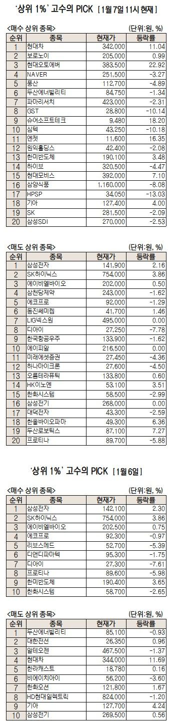 한편 이날 주식 초고수들의 순매도 상위 종목에는 삼성전자(005930), SK하이닉스(000660), 에이비엘바이오(298380) 등이 이름을 올렸다. 전일 기준으로는 삼성전자, SK하이닉스, 에이비엘바이오가 순매수 상위 1~3위였다. 전일 순매도 상위에는 두산에너빌리티(034020), 대한전선(001440), 알테오젠(196170)이 올랐다.