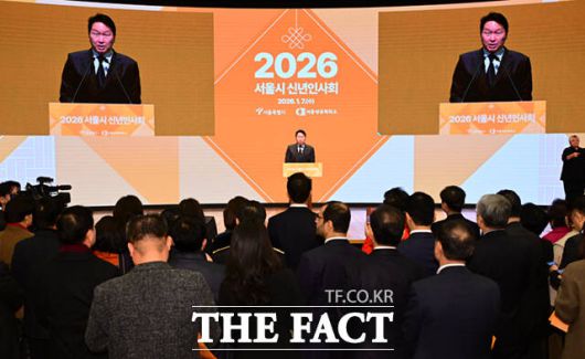 [더팩트ㅣ이새롬 기자] 오세훈 서울시장이 7일 서울 중구 대한상공회의소에서 열린 2026 서울시 신년인사회에 참석해 신년사를 하고 있다.