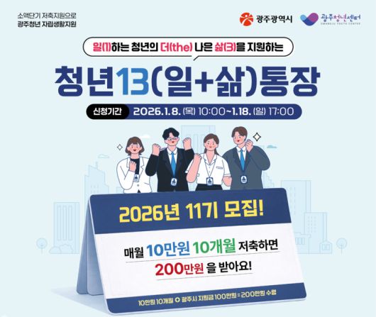 광주시는 일(1)하는 청년의 더 나은 삶(3)을 지원하는 ‘청년13(일+삶)통장’ 제11기 참여자를 8일부터 18일까지 모집한다.