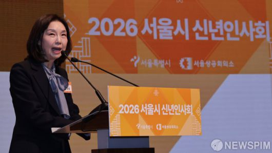 [서울=뉴스핌] 양윤모 기자 = 최호정 서울시의회 의장이 7일 오전 서울 중구 대한상공회의소 국제회의장에서 개최된 '2026년 서울시 신년인사회'에 참석해 신년사를 하고 있다.행사에는 오세훈 서울시장, 최태원 서울상의 회장, 최 서울시의회 의장, 정근식 서울시교육감, 서영교 더불어민주당 국회의원, 나경원 국민의힘 국회의원,구청장 등 800여명이 참석했다. 2026.01.07 yym58@newspim.com