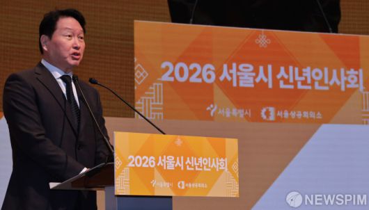 [서울=뉴스핌] 양윤모 기자 = 최태원 서울상의 회장이 7일 오전 서울 중구 대한상공회의소 국제회의장에서 개최된 '2026년 서울시 신년인사회'에 참석해 신년사를 하고 있다.행사에는 오세훈 서울시장, 최 서울상의 회장, 최 서울시의회 의장, 정근식 서울시교육감, 서영교 더불어민주당 국회의원, 나경원 국민의힘 국회의원,구청장 등 800여명이 참석했다. 2026.01.07 yym58@newspim.com
