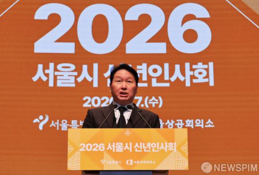 [서울=뉴스핌] 양윤모 기자 = 최태원 서울상의 회장이 7일 오전 서울 중구 대한상공회의소 국제회의장에서 개최된 '2026년 서울시 신년인사회'에 참석해 신년사를 하고 있다.행사에는 오세훈 서울시장, 최 서울상의 회장, 최 서울시의회 의장, 정근식 서울시교육감, 서영교 더불어민주당 국회의원, 나경원 국민의힘 국회의원,구청장 등 800여명이 참석했다. 2026.01.07 yym58@newspim.com