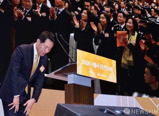 [서울=뉴스핌] 양윤모 기자 = 오세훈 서울시장이 7일 오전 서울 중구 대한상공회의소 국제회의장에서 개최된 '2026년 서울시 신년인사회'에 참석해 신년사회에 참석해 고개숙여 인사하고 있다.행사에는 오 서울시장, 최태원 서울상의 회장, 최호정 서울시의회 의장, 정근식 서울시교육감, 서영교 더불어민주당 국회의원, 나경원 국민의힘 국회의원,구청장 등 800여명이 참석했다. 2026.01.07 yym58@newspim.com