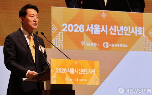 [서울=뉴스핌] 양윤모 기자 = 오세훈 서울시장이 7일 오전 서울 중구 대한상공회의소 국제회의장에서 개최된 '2026년 서울시 신년인사회'에 참석해 신년사회에 참석해 신년사를 하고 있다.행사에는 오 서울시장, 최태원 서울상의 회장, 최호정 서울시의회 의장, 정근식 서울시교육감, 서영교 더불어민주당 국회의원, 나경원 국민의힘 국회의원,구청장 등 800여명이 참석했다. 2026.01.07 yym58@newspim.com