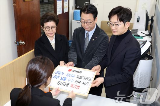 (서울=뉴스1) 유승관 기자 = 곽규택 국민의힘 원내수석대변인(가운데)과 강선영, 박충권 원내부대표가 7일 서울 여의도 국회 의안과에 '김병기·강선우 국회의원의 공천 뇌물 수수 의혹 사건 진상규명 특검법'을 제출하고 있다. (공동취재) 2026.1.7/뉴스1