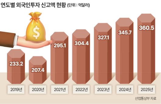 7일 산업통상자원부에 따르면 2025년 FDI 신고액은 360억5000만달러로, 전년 대비 4.3% 증가했다. 이는 1962년 통계 작성 이래 최고치다.