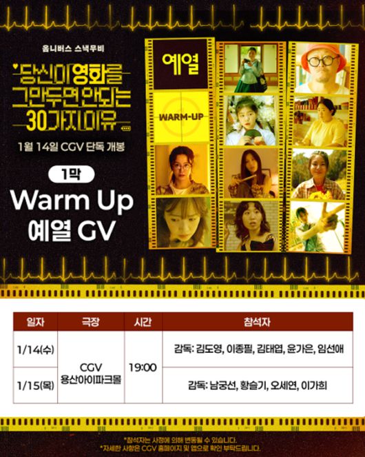 [스타데일리뉴스=조수현기자] CJ ENM과 한국예술종합학교 영상원 30주년을 기념한 합작 프로젝트이자 현재 한국 영화계에서 가장 주목받는 감독들이 총출동해 선보이는 특별한 옴니버스 스낵무비 <당신이 영화를 그만두면 안 되는 30가지 이유>가 1막 '예열' 포스터 공개와 함께 개봉 1주차 GV 일정을 공개했다.