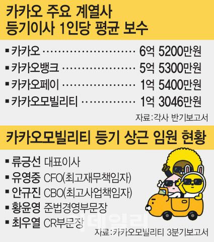 카카오 주요 계열사 등기이사 1인당 평균 보수 및 카카오모빌리티 등기 상근 임원 현황(그래픽=문승용 기자) |