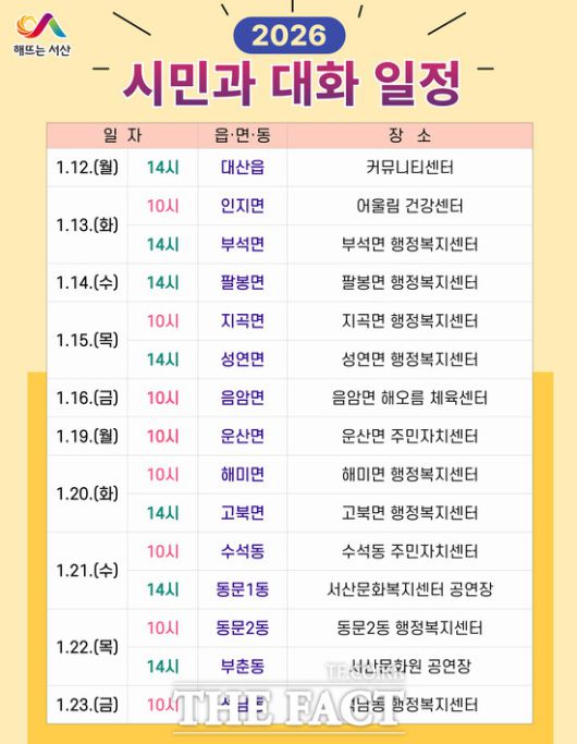 [더팩트ㅣ서산=이수홍 기자] 충남 서산시가 이달 12일부터 관내 15개 읍면동 순회를 하며 새해 시민들과 소통하는 일정을 추진한다.