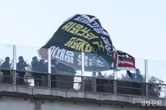 태안화력 고 김충현 대책위가 7일 서울 중구 서울로에서 발전소 비정규직 문제 관련 기습 현수막 시위를 하고 있다. 이번 시위는 석탄화력 고용안전 협의체 회의를 앞두고 정부 압박 차원에서 열렸다. 성동훈 기자 |