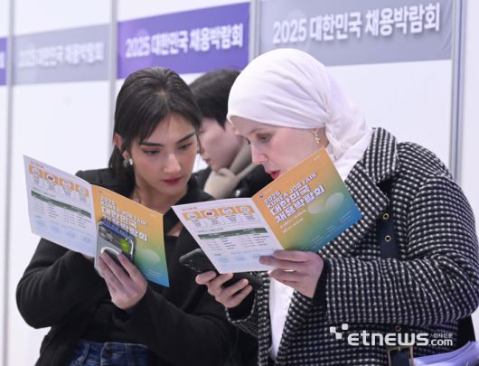 2025 대한민국 채용박람회 외국인투자기업관에서 외국 참가자들이 책자를 보며 의견을 나누고 있다. 박지호기자 jihopress@etnews.com |