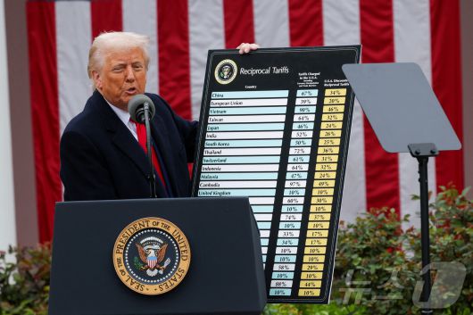 도널드 트럼프 미국 대통령이 2일(현지시간) 미국 워싱턴 D.C. 백악관 로즈가든에서 상호 관세 부과 방침을 전격 발표하고 있다. ⓒ 로이터=뉴스1 |