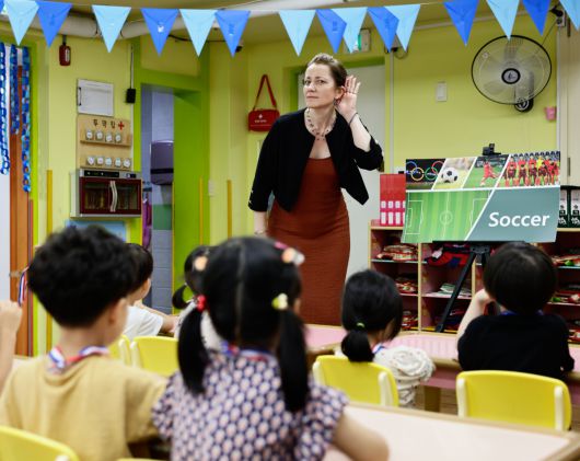 한 원어민 교사가 어린이집에서 수업을 하고 있다. |